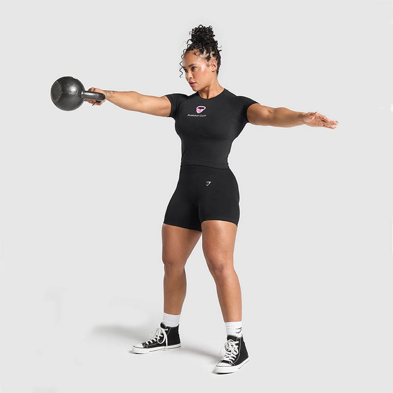 Make sure you are hinging at the hips, rather than squatting. At the start of the movement, you should push your hips back, tilting your pelvis, so there is a slight bend in your knees (similar to an RDL or good morning). Imagine you are pushing a door closed behind you with your butt, rather than bending your knees into a squat. Then, as you swing the kettlebell up, extend your legs, straightening them and squeezing your glutes. (FYI: Don’t wear anything restrictive for these! Split seam shorts are ideal as they allow freedom of movement, while seamless shorts help you glide through every swing.)